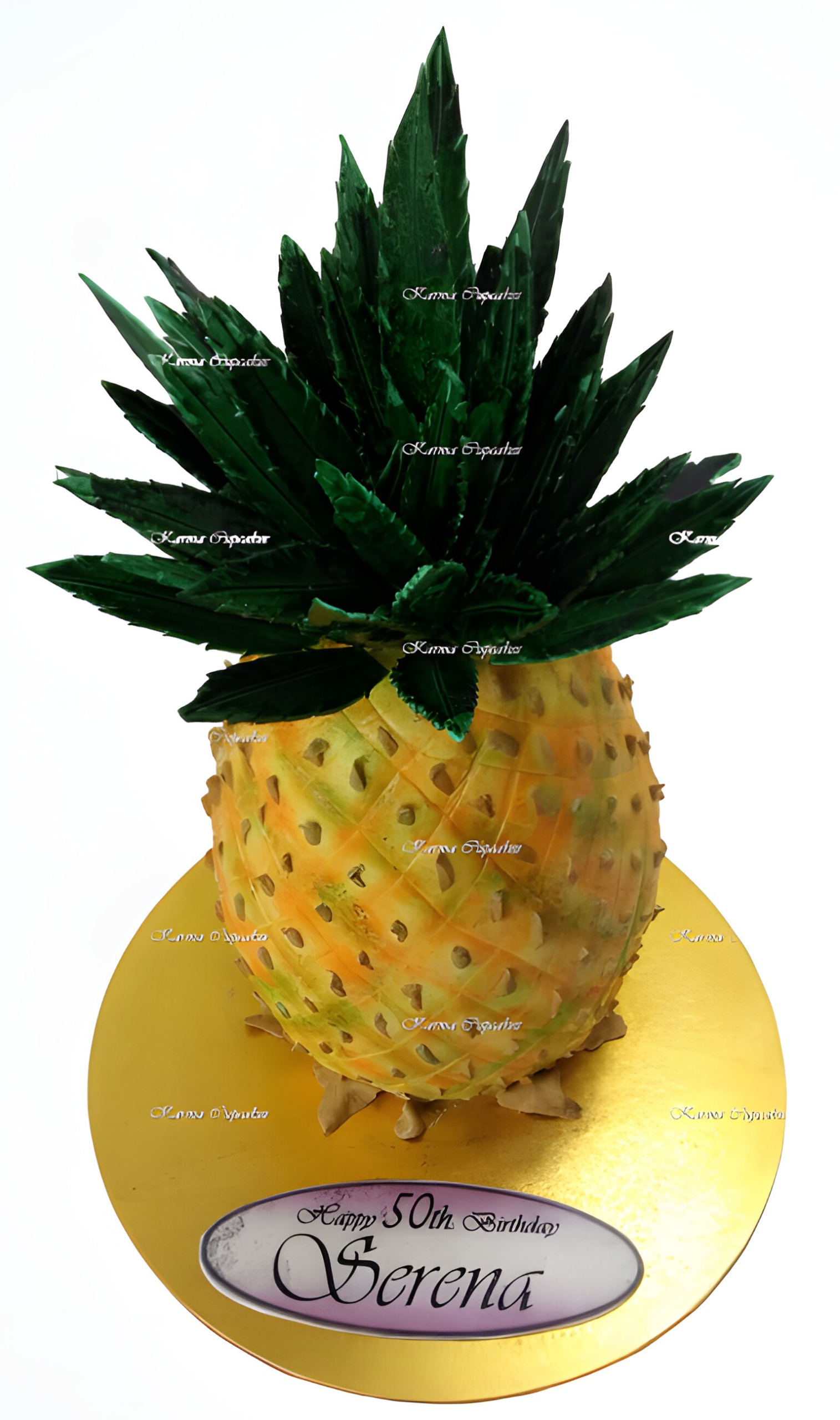 Fondant Iced 3D Pineapple Cake in chocolate or vanilla flavour on a Silver Masonite Board and optional Birthday Greeting. Serves 24-30 cafe size slices