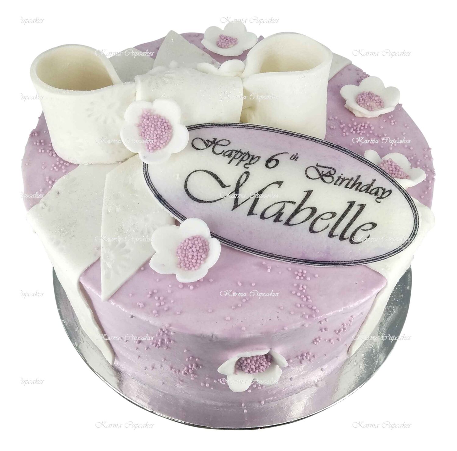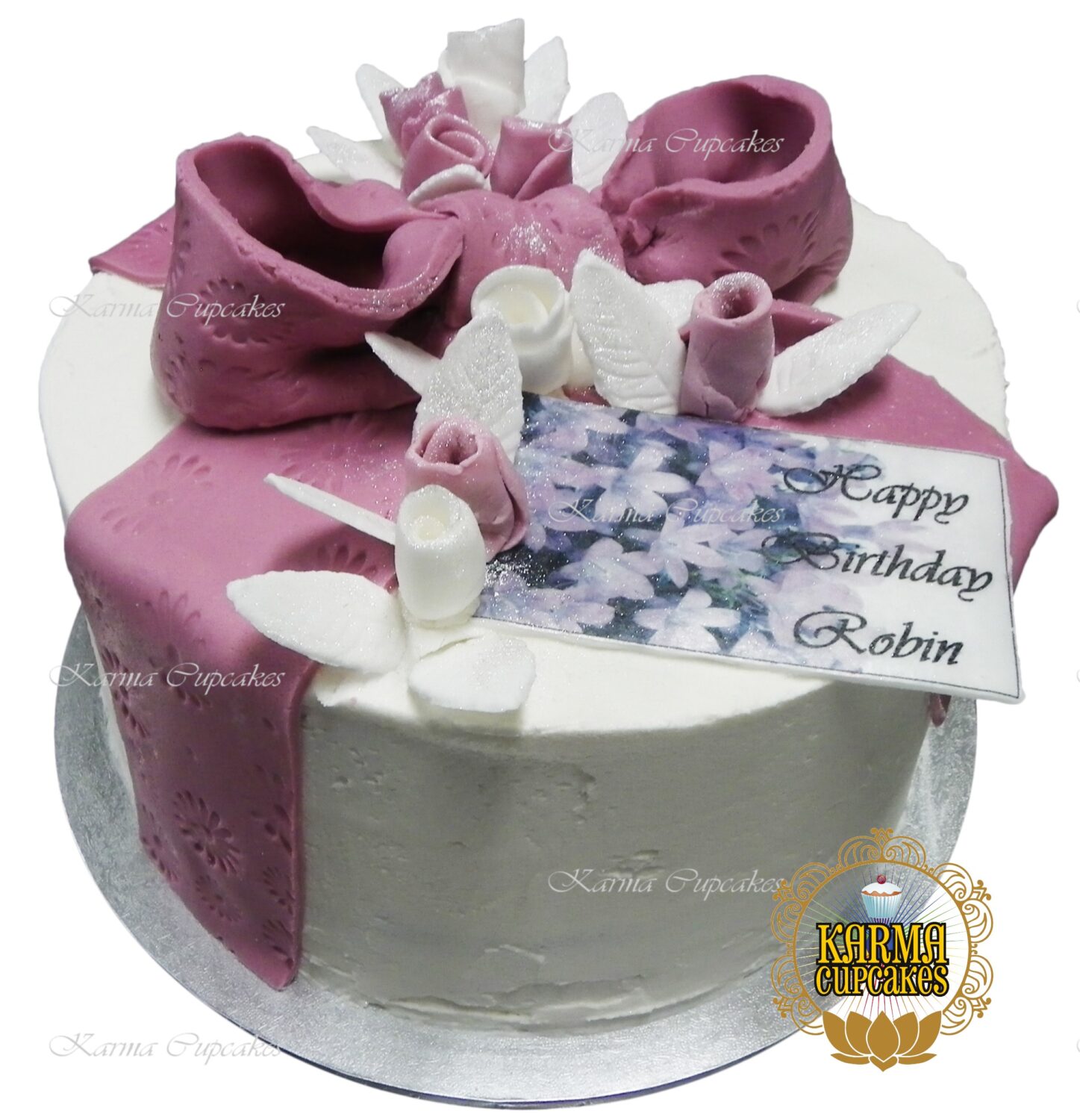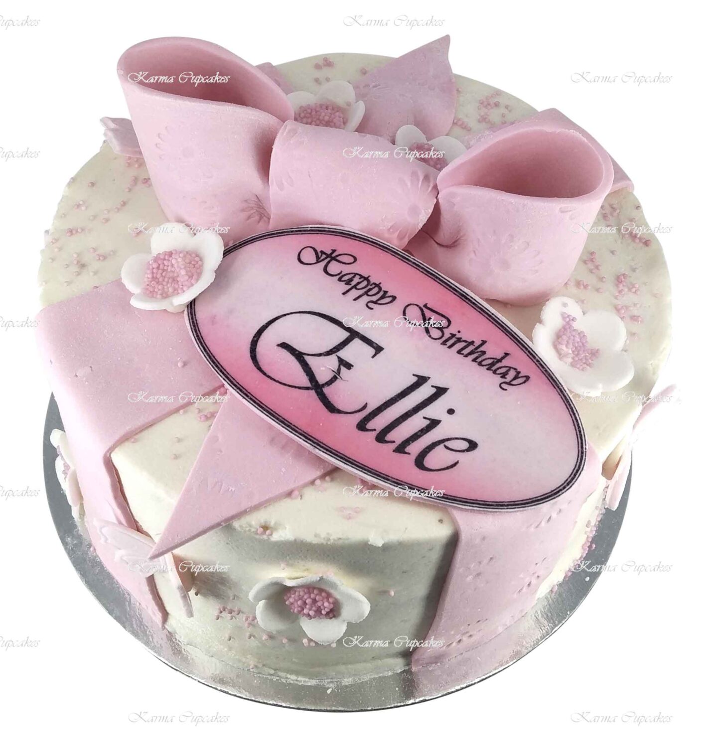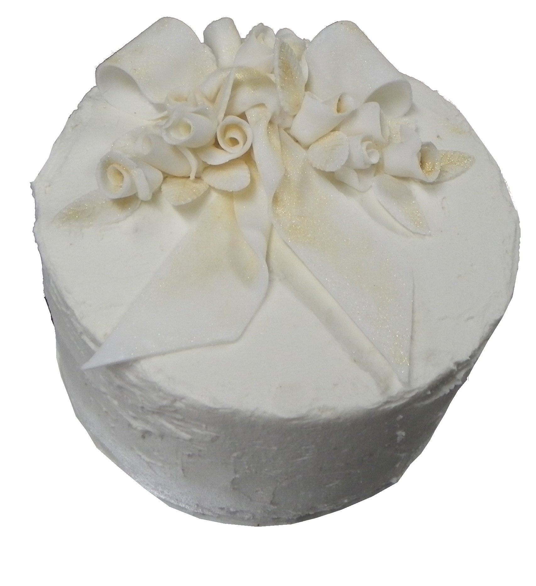 Buttercream Iced 8 inch Cake with Sugar Bow & Flowers – serves 16 cafe size portions.