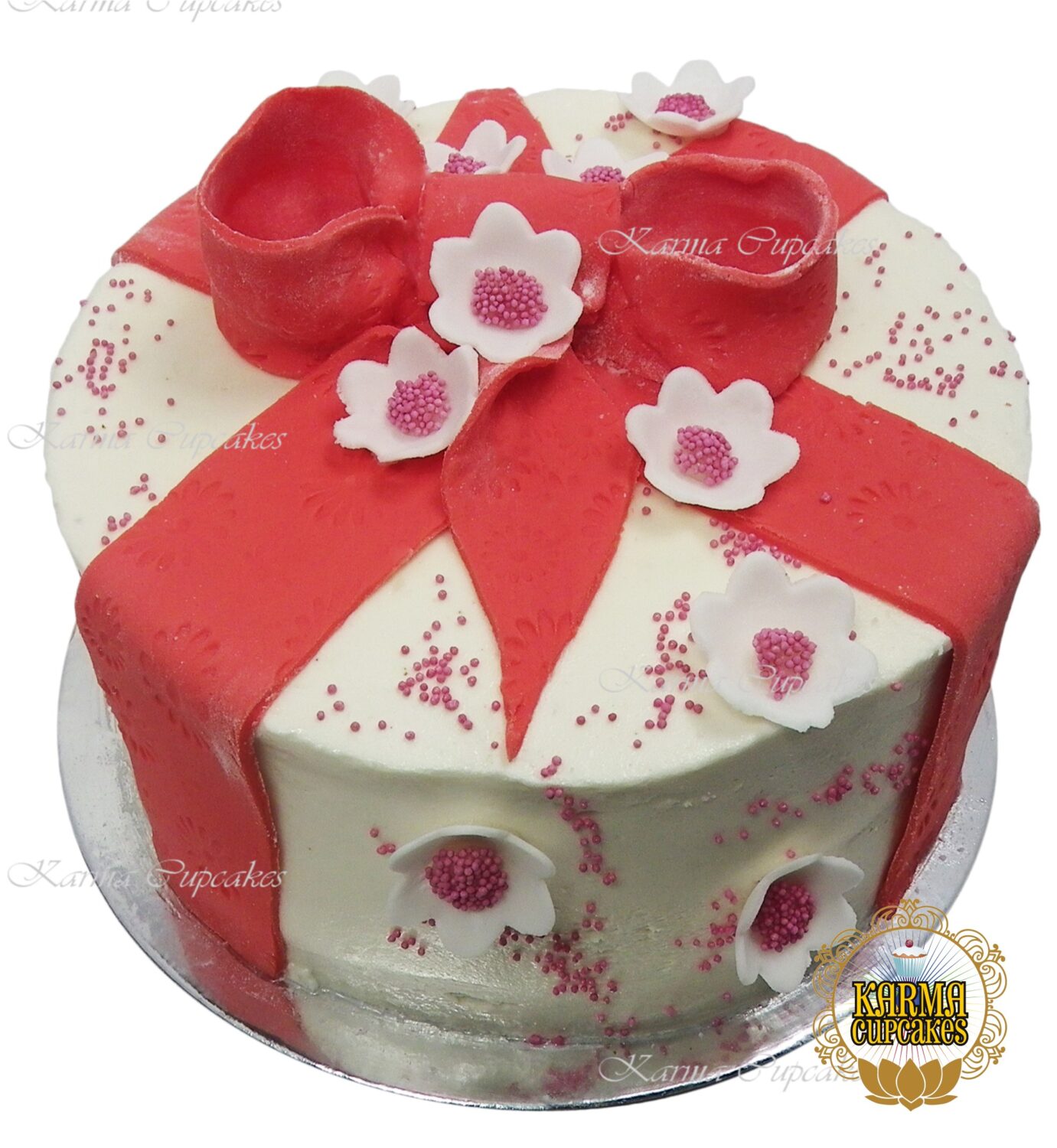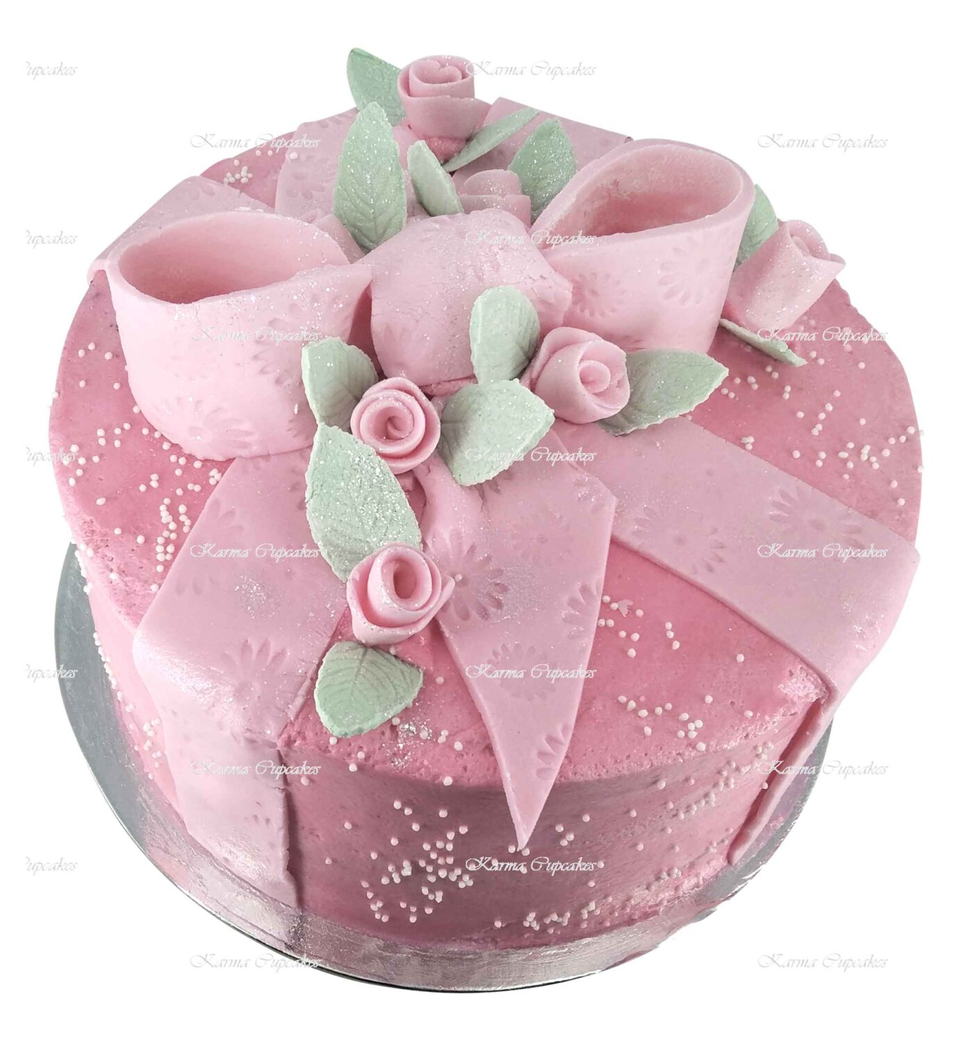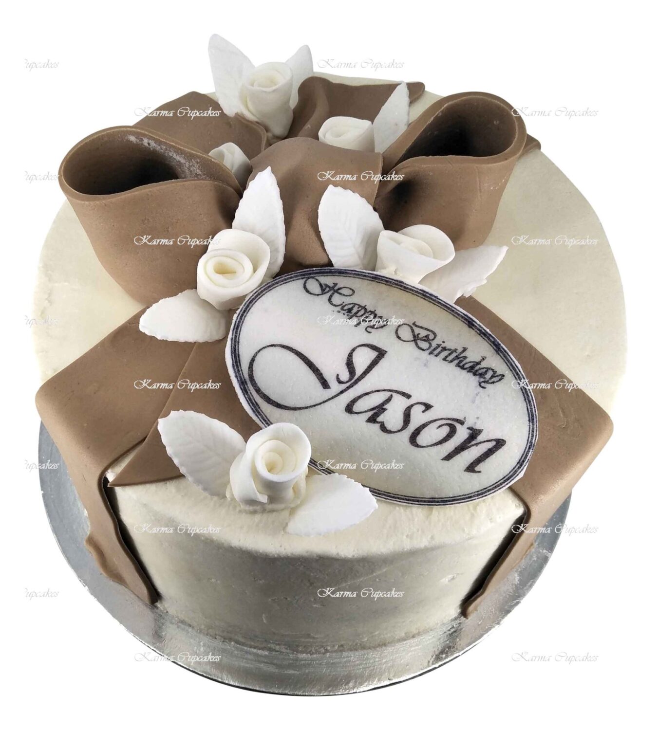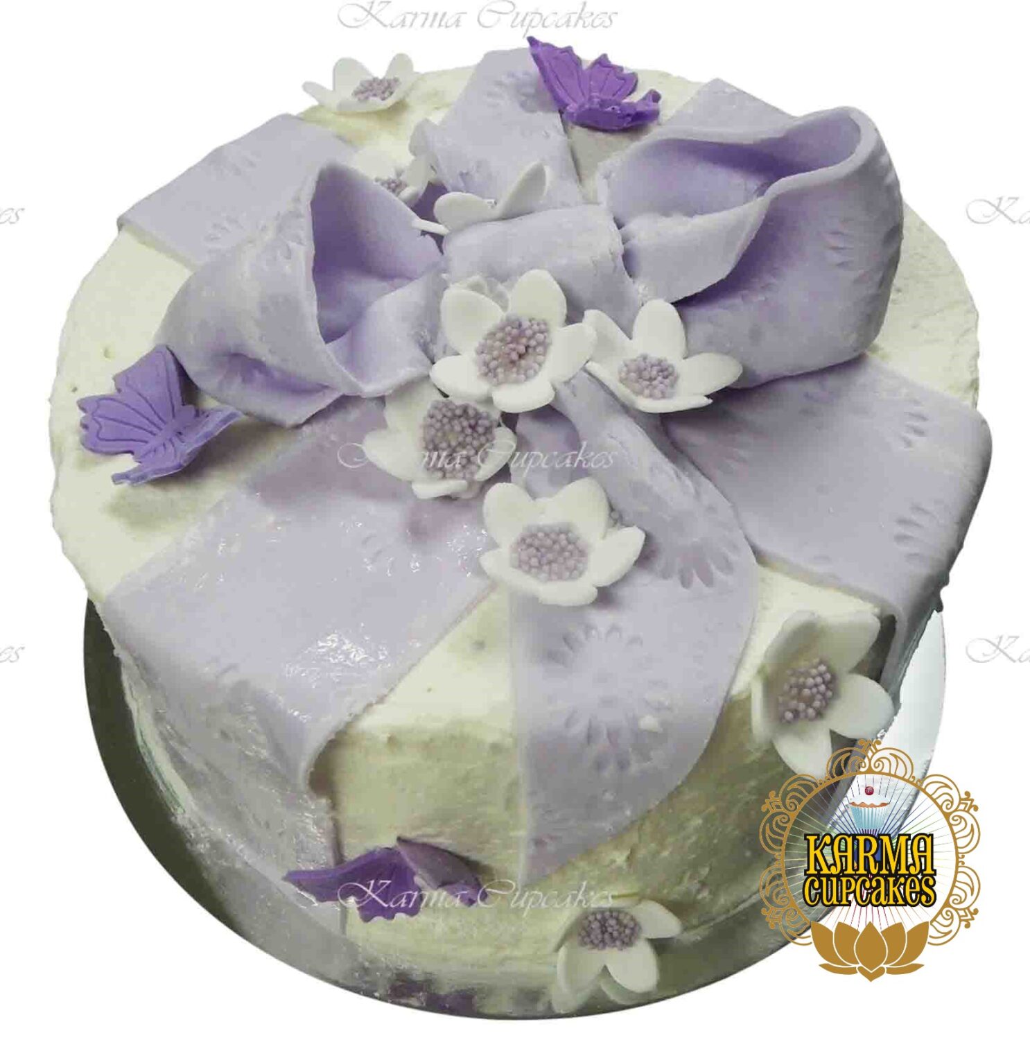 Buttercream Iced 8 inch Cake with Sugar Bow & Flowers – serves 16 cafe size portions.