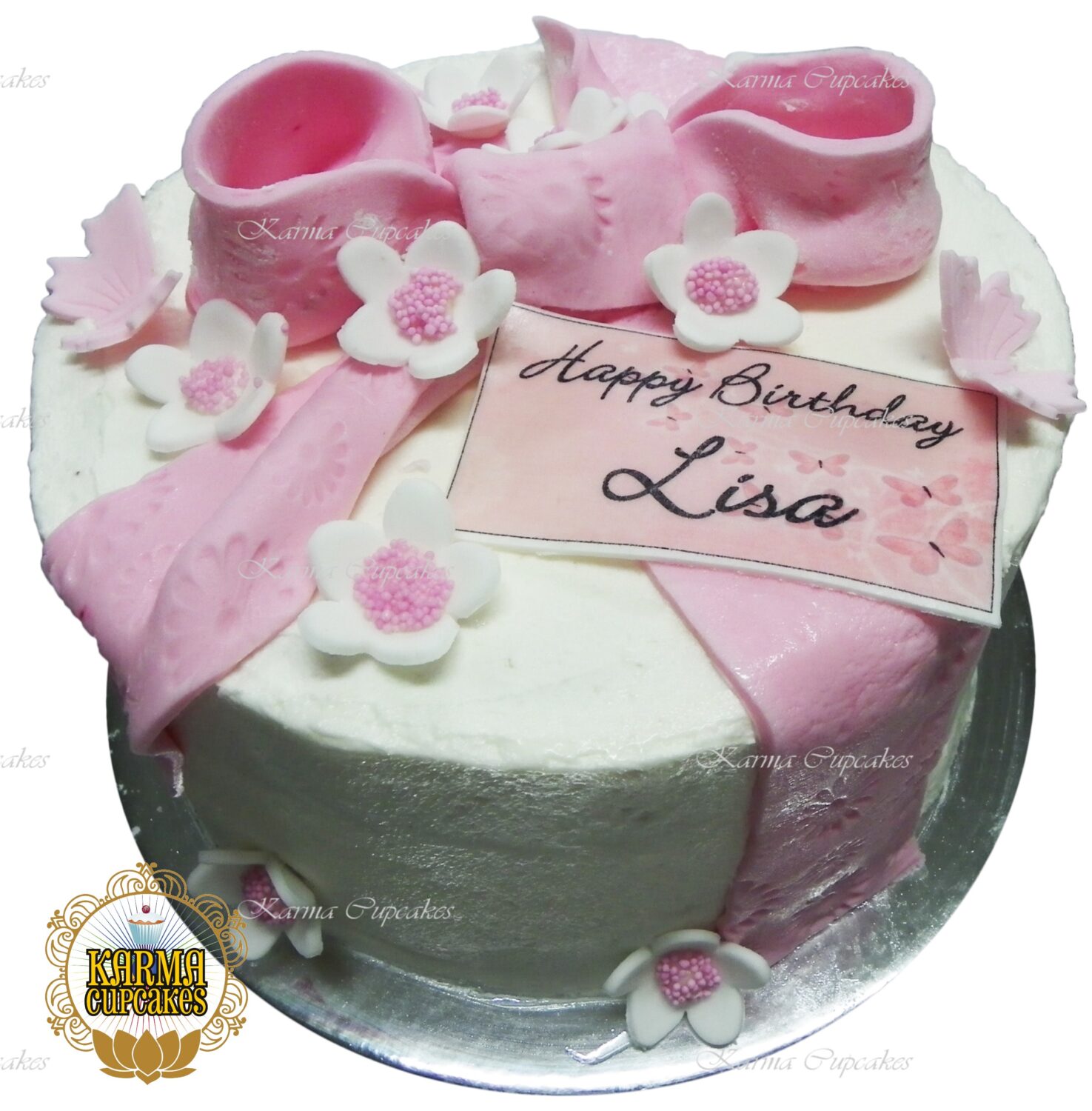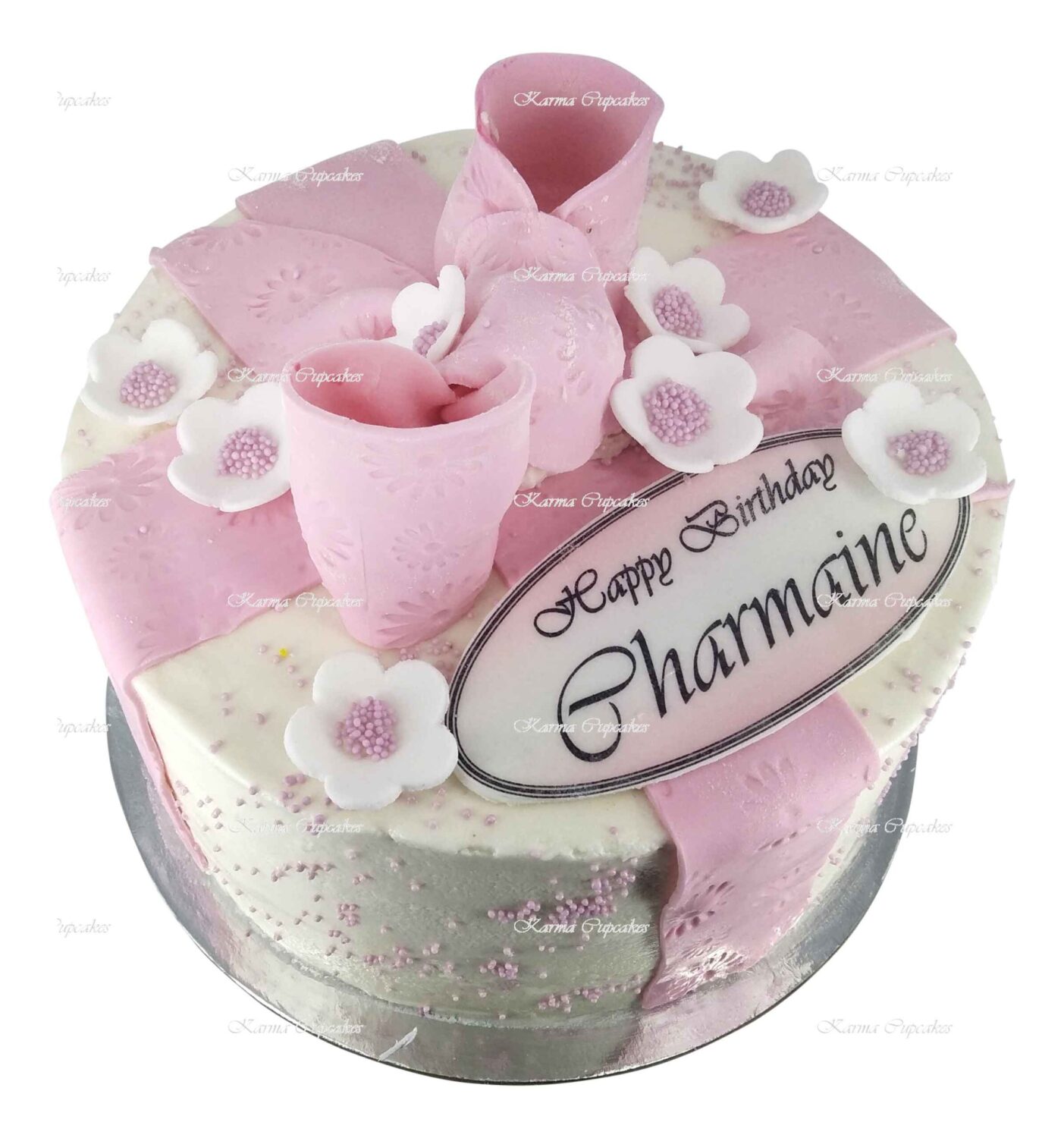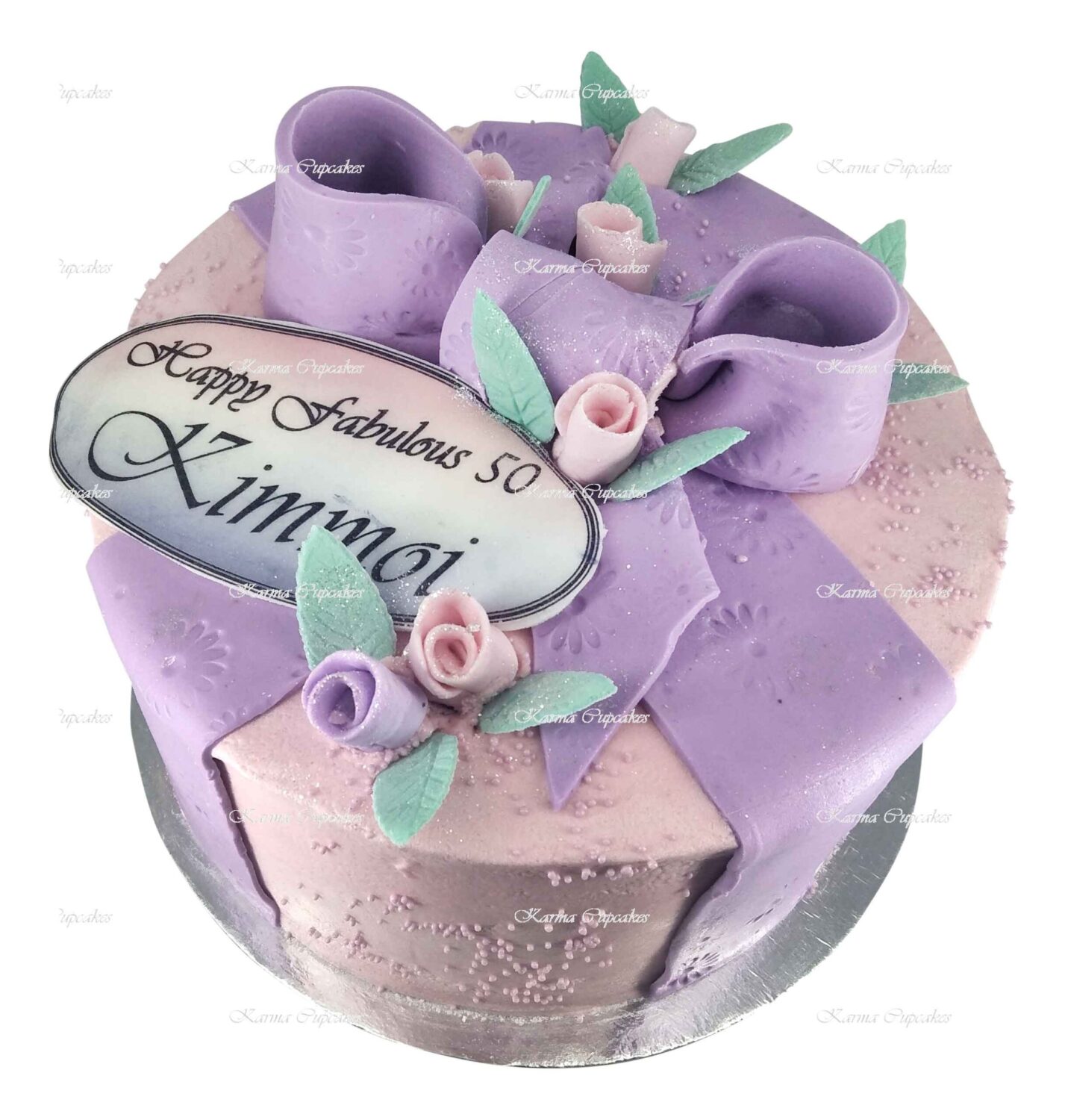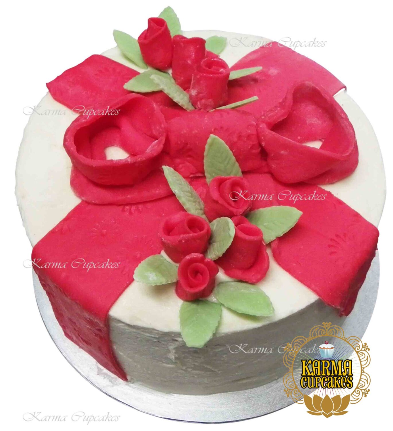 Buttercream Iced 8 inch Cake with Sugar Bow & Flowers – serves 16 cafe size portions.