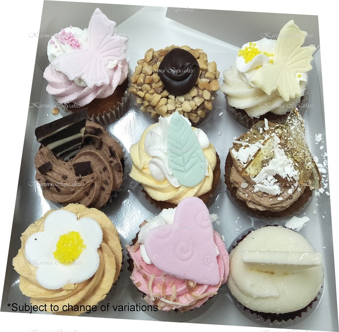 Each box has a variety of petite high tea cupcakes and flavours. This includes Red Velvet, Chocolate Mud, Honey & Lavender, Chocolate mud cake, Coconut & Raspberry (*g/f) , Vanilla & Butterscotch, Choc/ mint Hazelnut (*g/f), Almond & Coffee (*g/f), Orange and almond (*g/f) , Peanut Butter & Chocolate, Banana, Caramel and toffee. * variations are subject to change.