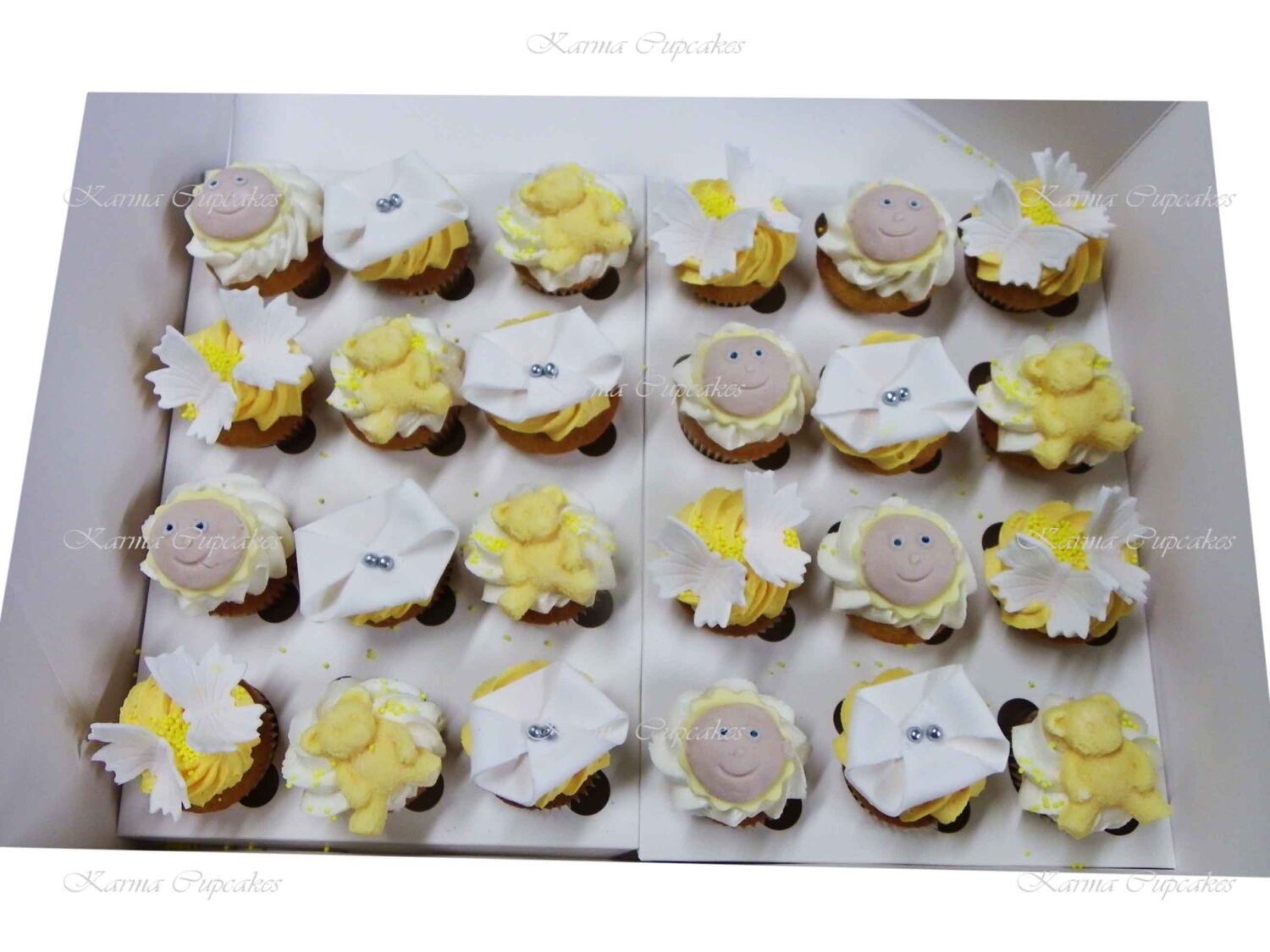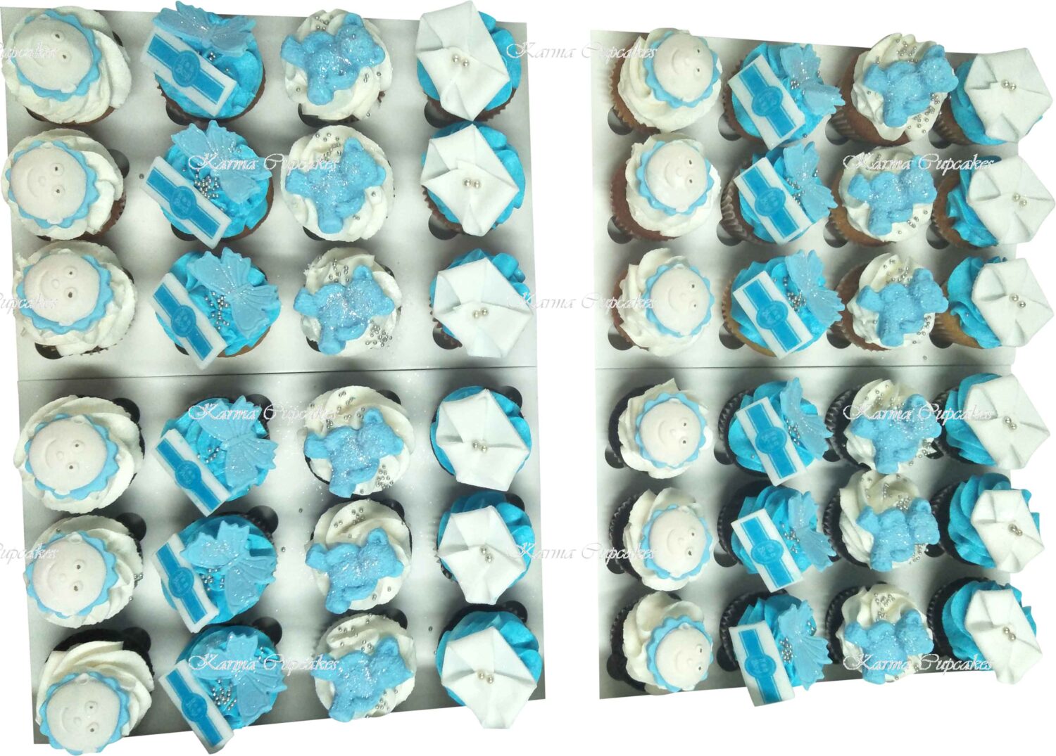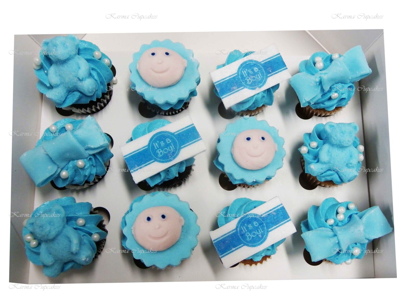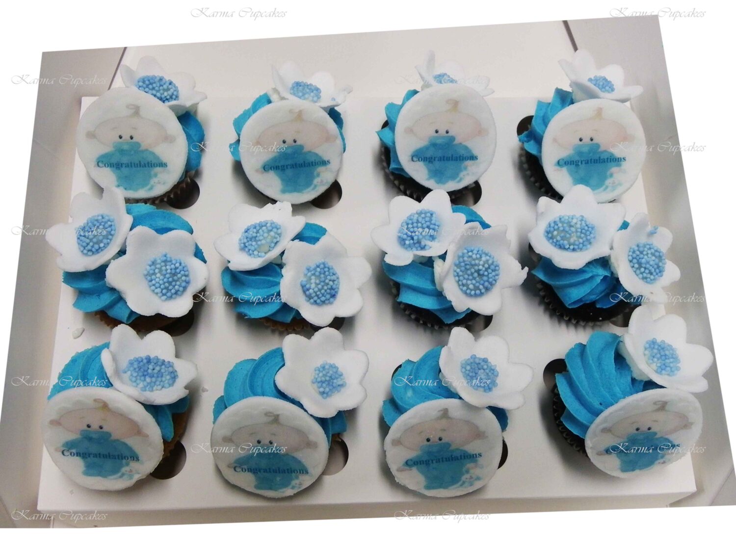 Our Chocolate and Vanilla Baby Gender Surprise Cupcakes are topped with classic swirl of buttercream icing. On our cupcakes are teddy bears, flowers, butterflies, baby faces and nappies. Also “it’s a boy” or “it’s a girl” on edible sugar plaque. Ideal for baby showers and parties. Please advise at check out in the comments section if you require boy or girl cupcakes.
