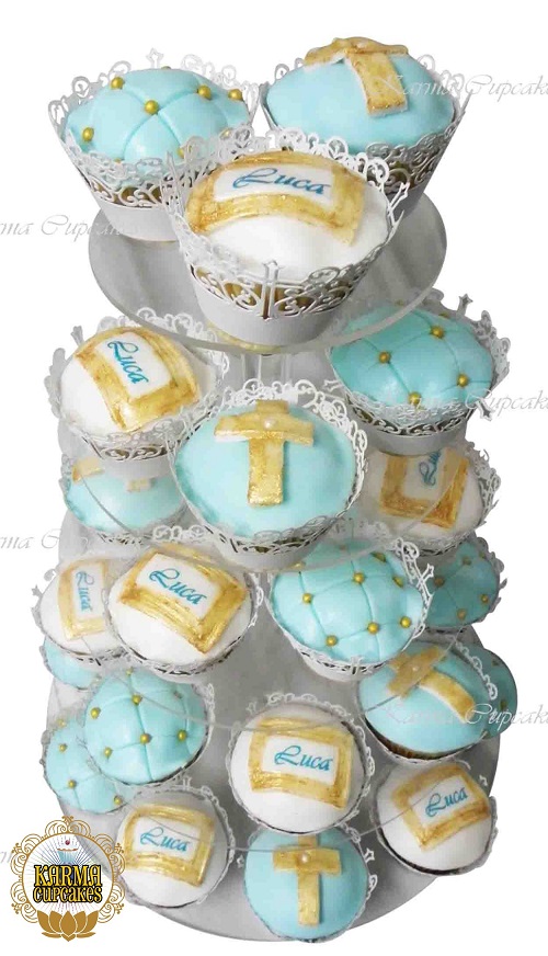 12 Chocolate and Vanilla Cupcakes topped with Gold, White and Tiffany Blue icing.