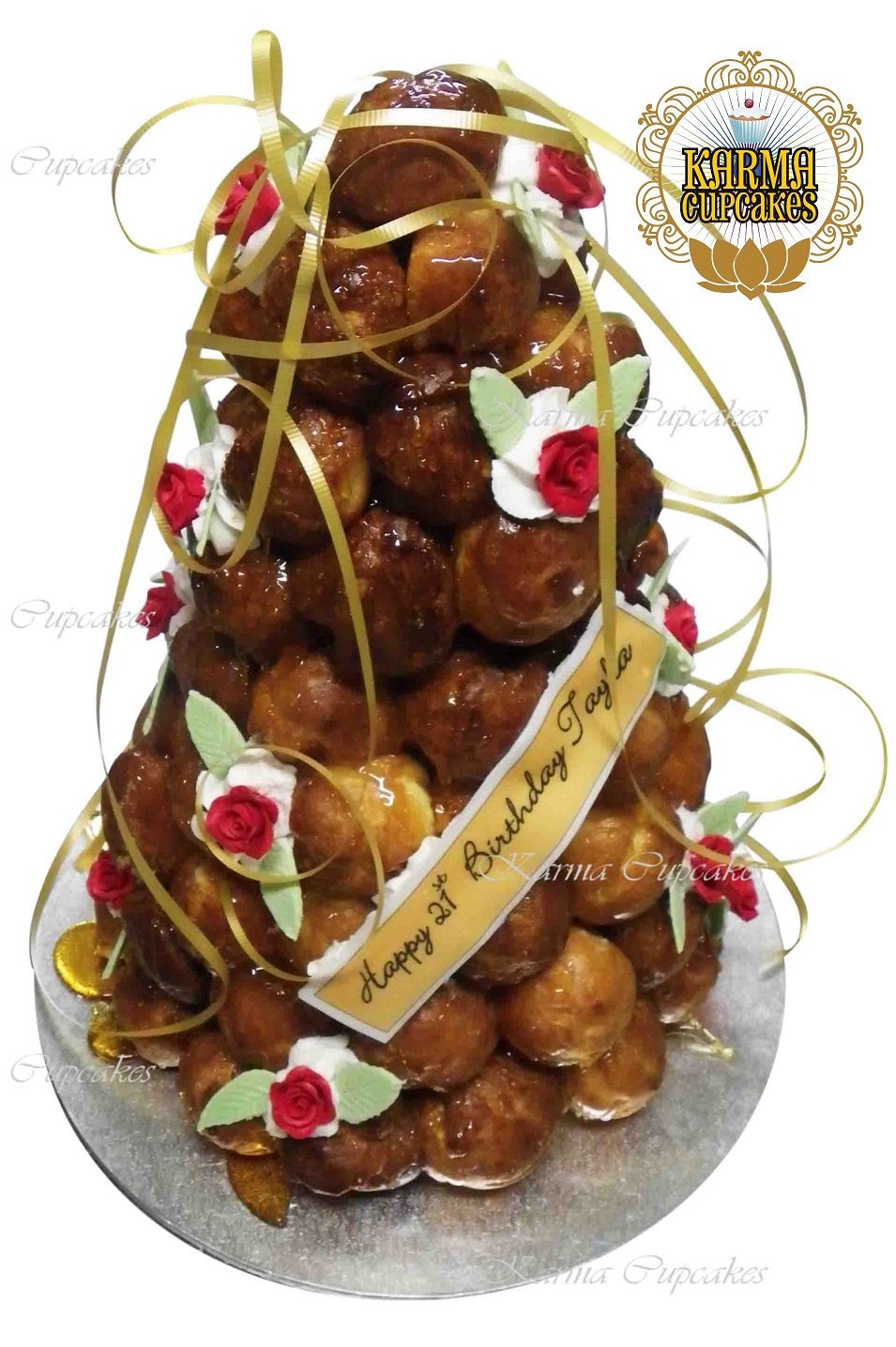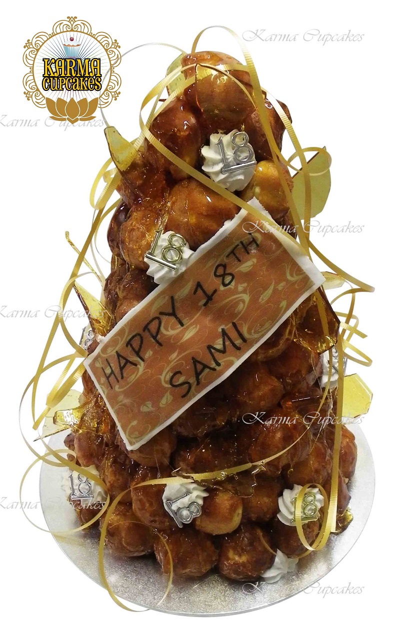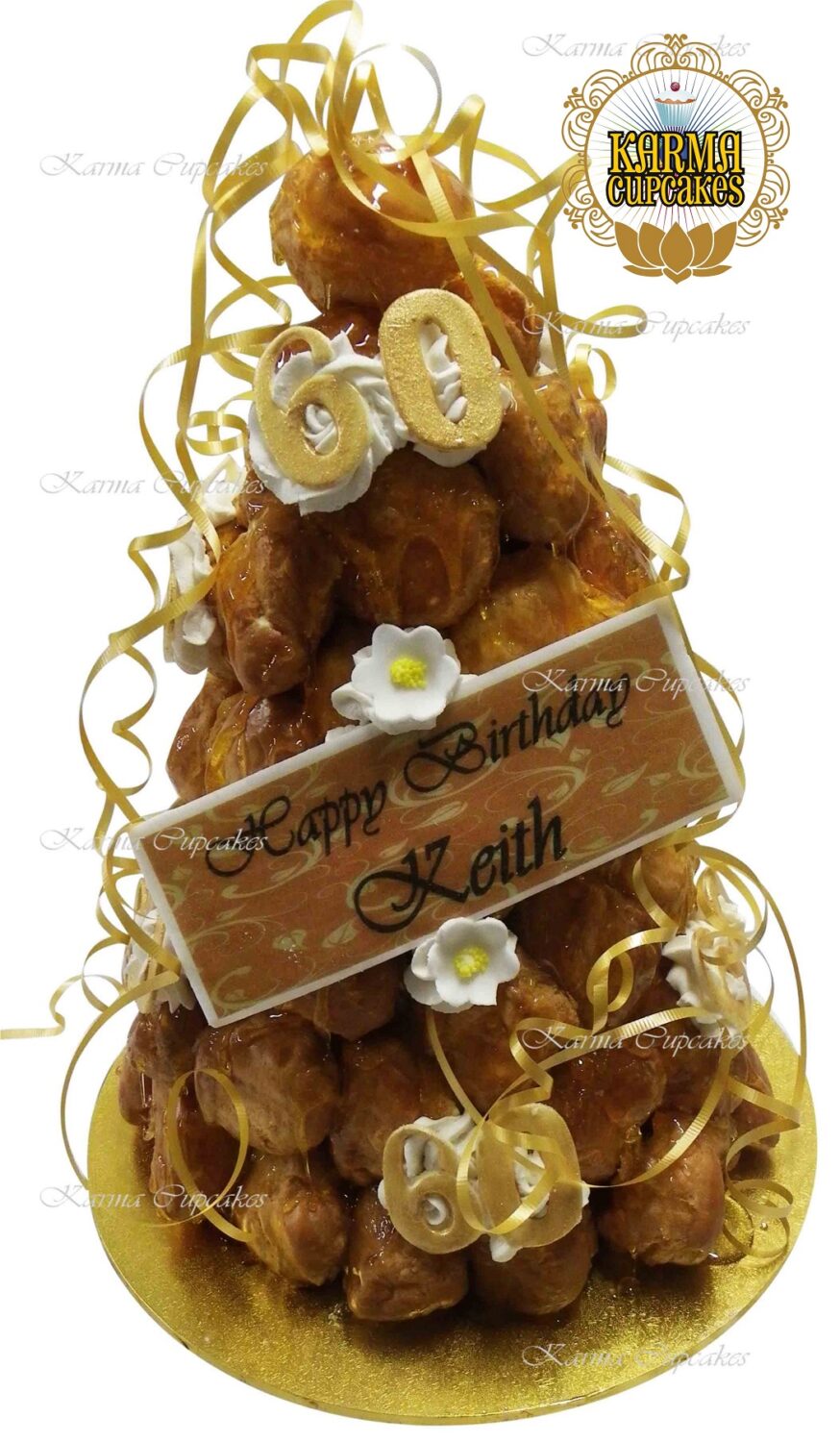 Our croquembouche is made with 50 custard cream or chocolate filled profiteroles covered in toffee and decorated with handmade sugar “age” pieces or sugar flowers. The price includes ribbon, large packing box and gold board.