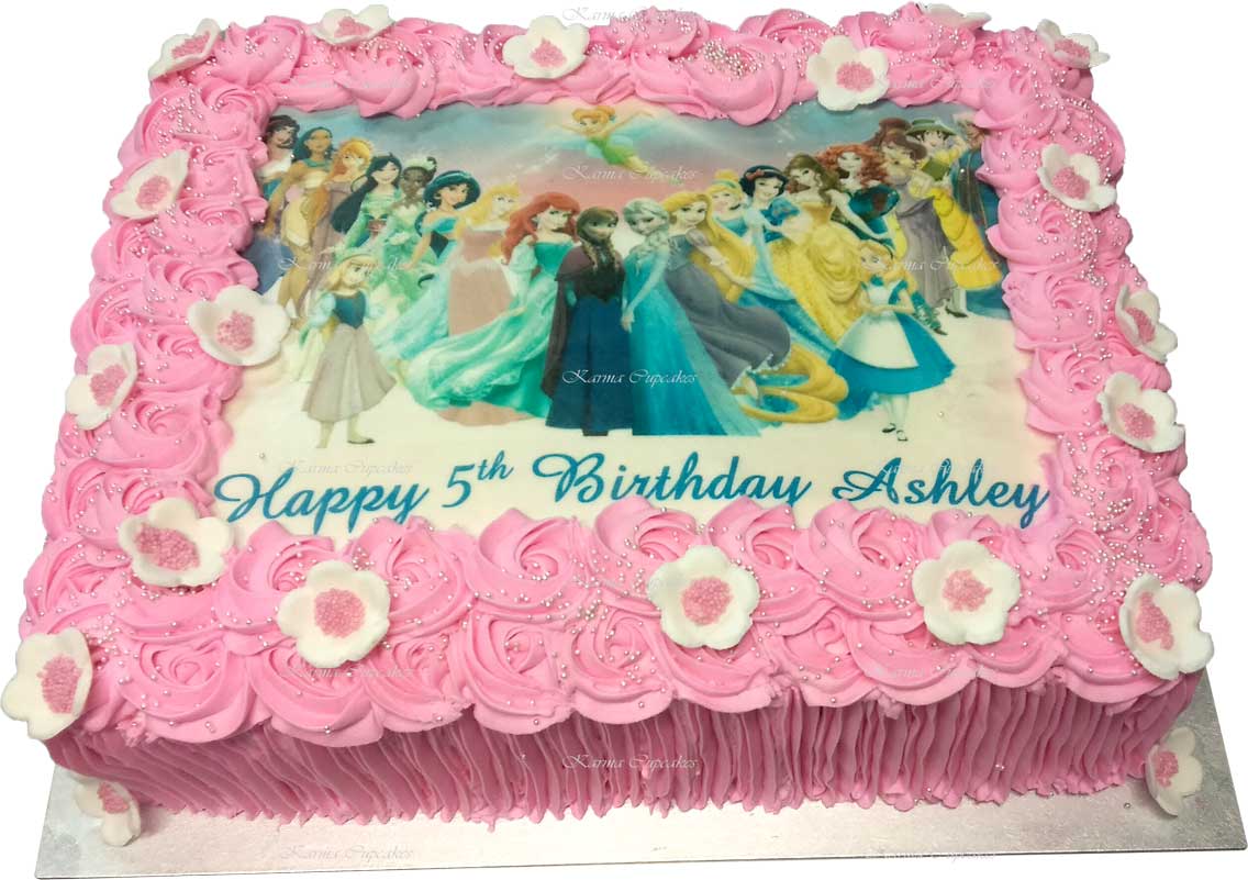 Buttercream iced 1/2 slab with edible image of Cinderella with edible sugar flowers. Serves 40-50 people.