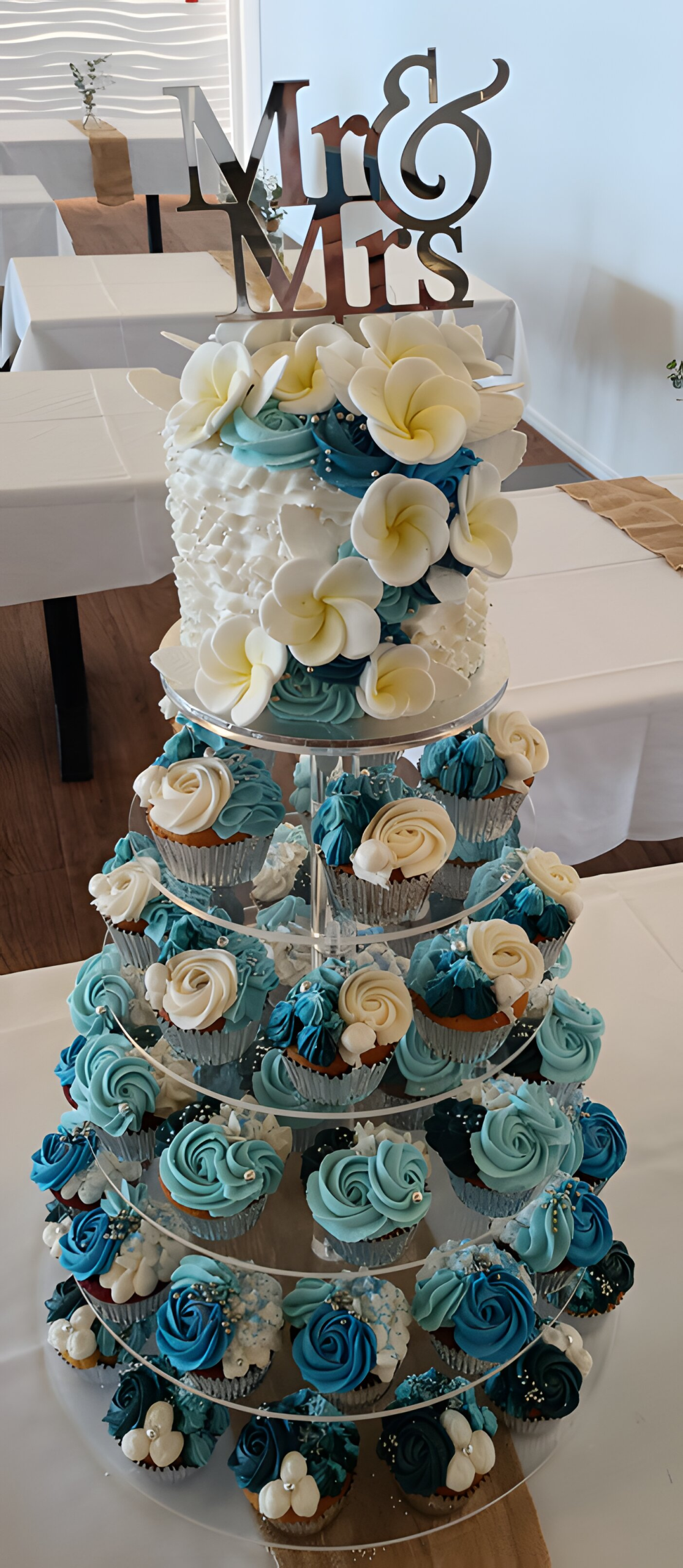 This elegant cupcake tower suitable for a wedding or birthday features a 6 inch cake buttercream ruffle and rose swirls with sugar frangipanis.
