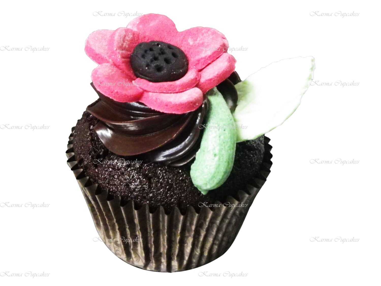 Chocolate and vanilla with a rose swirl of buttercream and a poppy.
