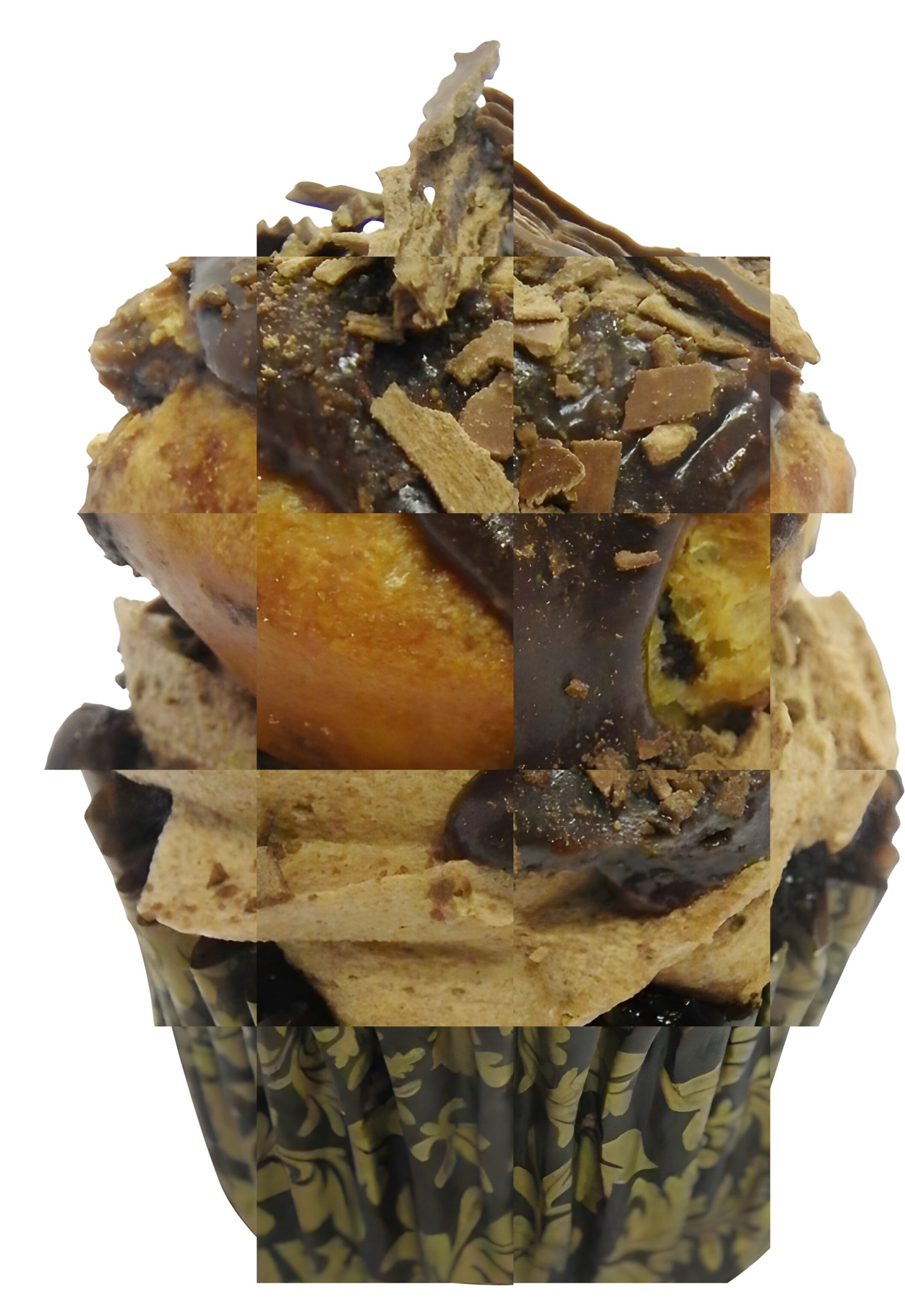 Chocolate mud cupcake topped with a chocolate custard filled profiterole, dipped in thick chocolate ganache with shaved chocolate flakes.