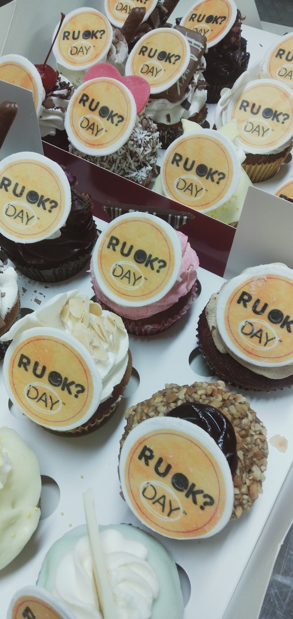 Mini High Tea cupcakes with topped with an approved R U OK? day edible logo.