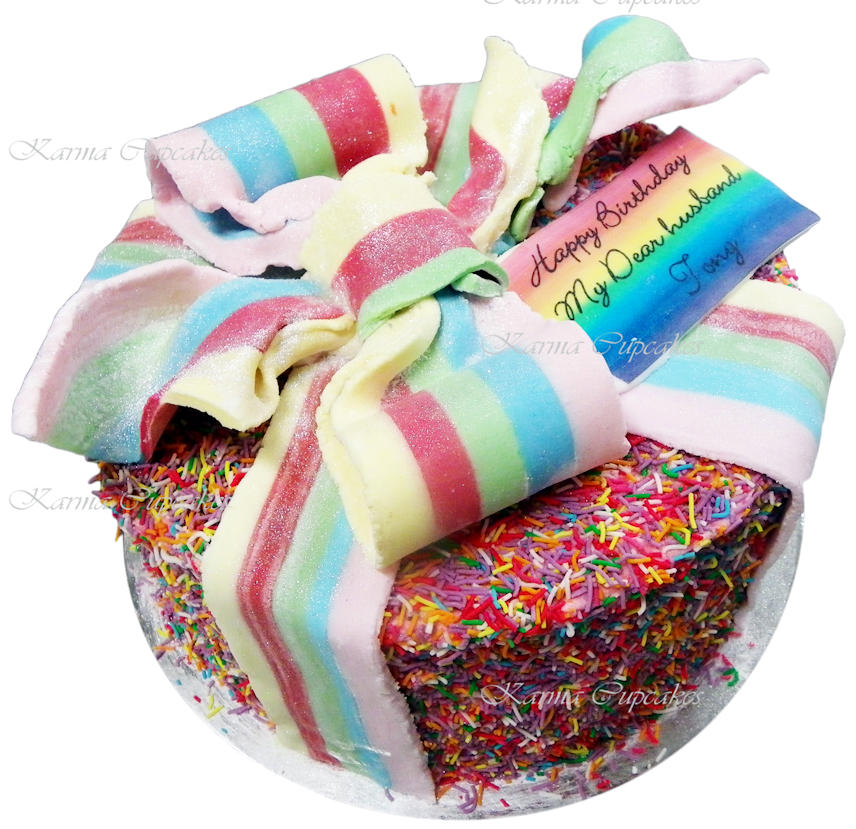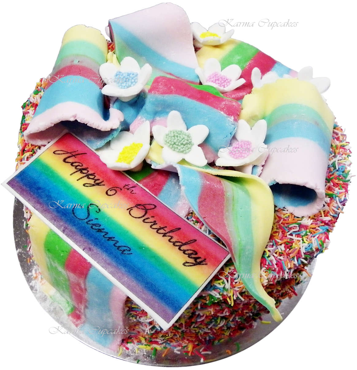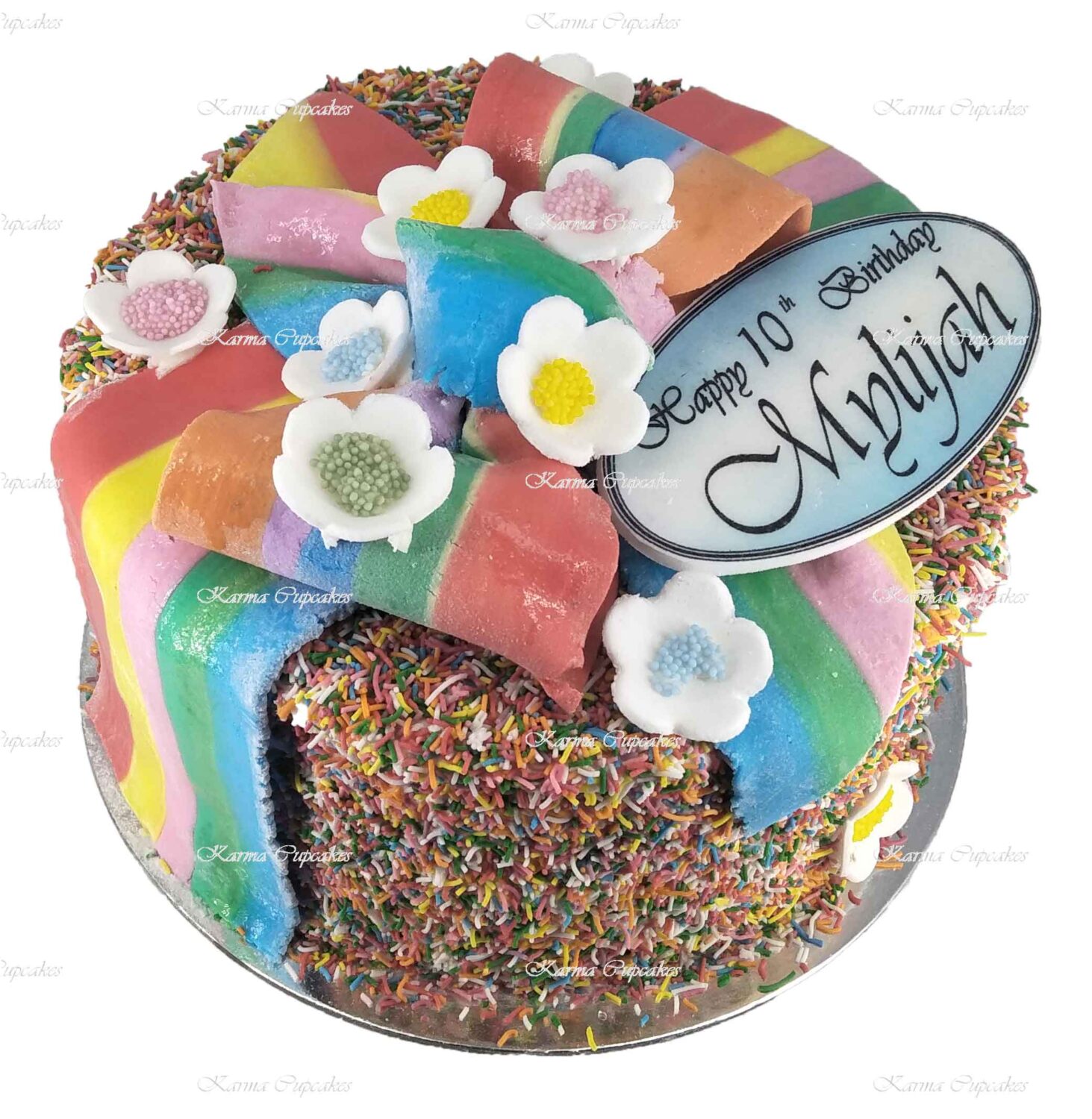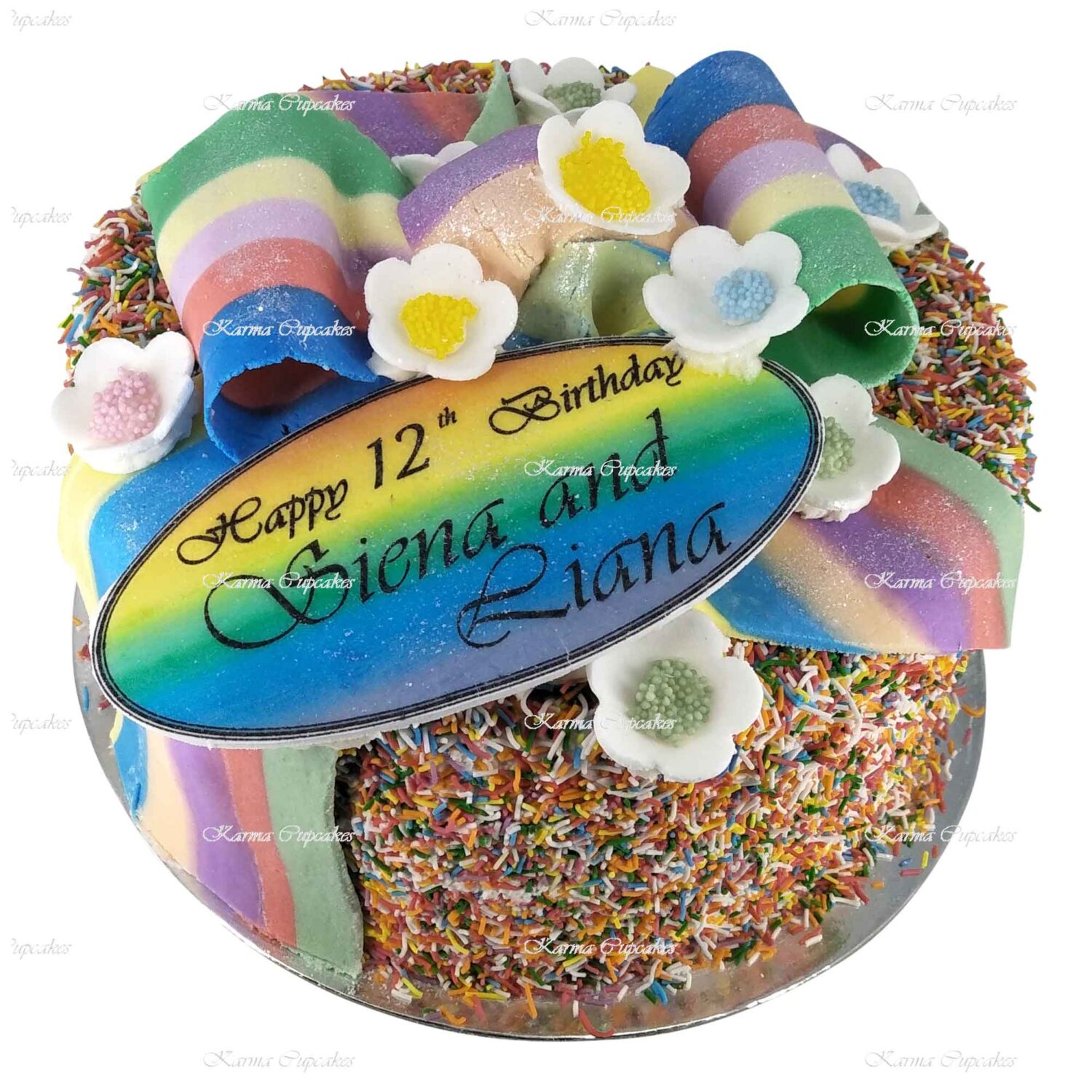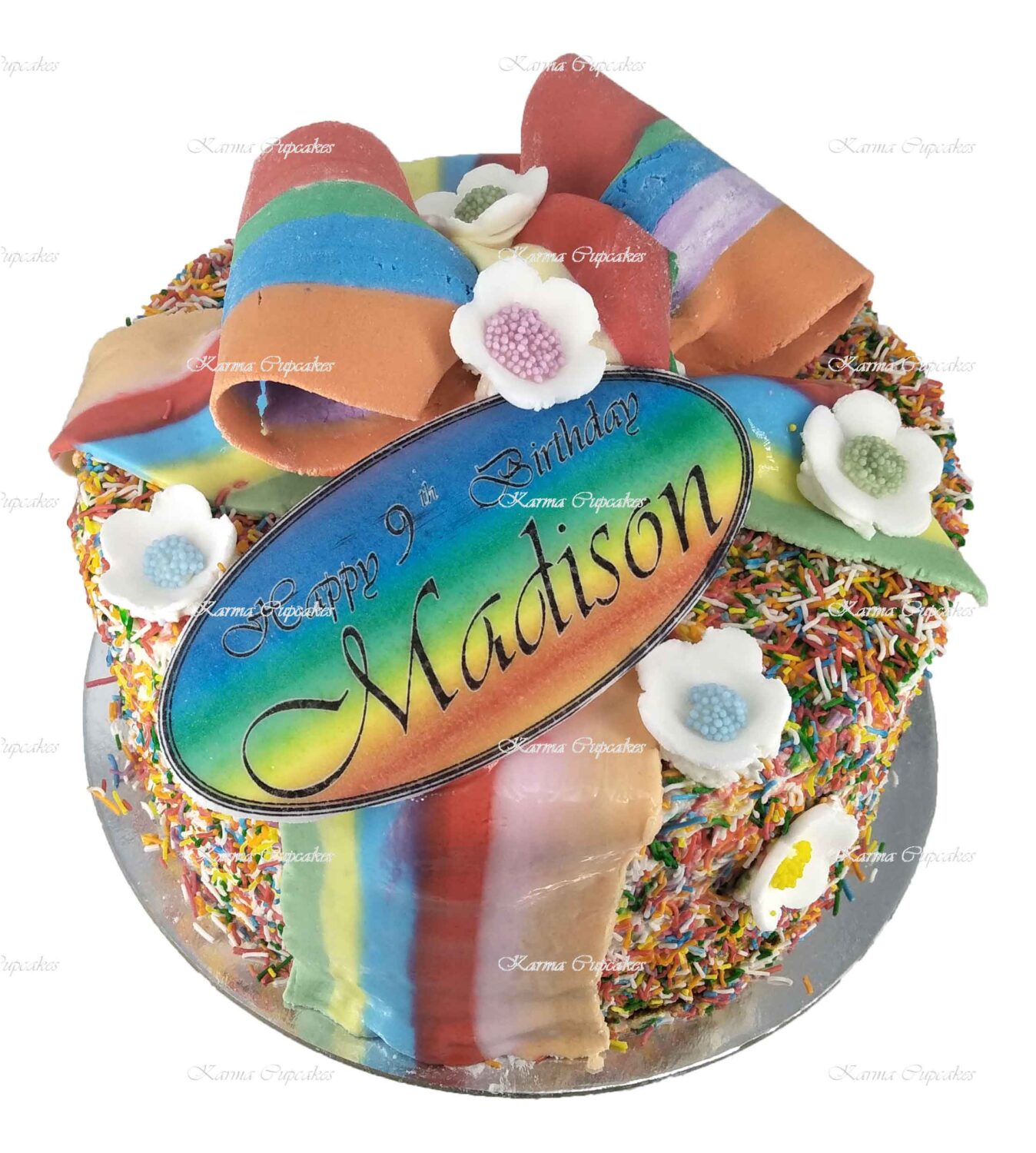 4 different coloured vanilla cake layers inside our 8″ Rainbow Buttercream Gateaux Birthday Cake topped with Sugar Edible Bows.
