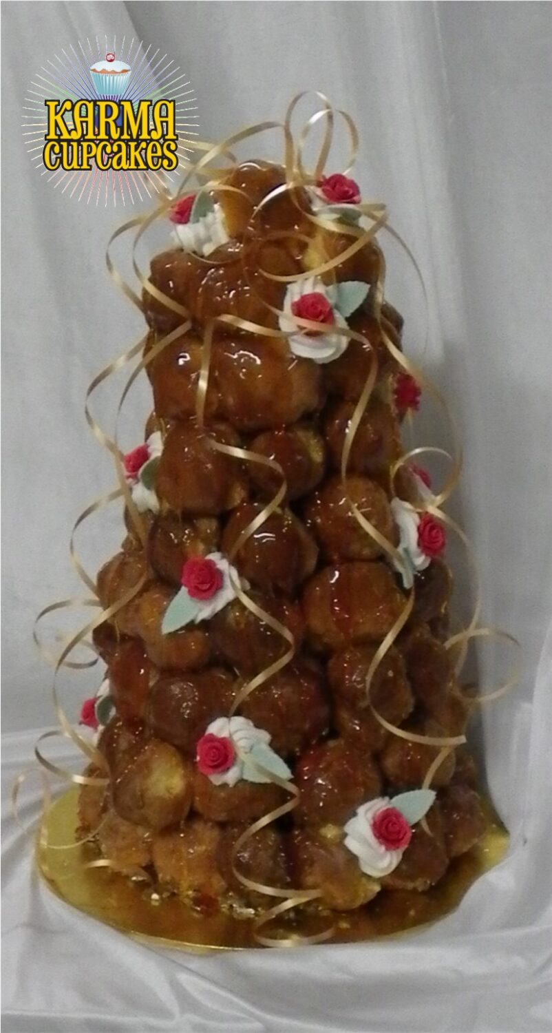 Our croquembouche is made with 75 custard cream or chocolate filled profiteroles covered in toffee and decorated with flower sugar pieces. The price includes ribbon,large packing box and metallic board.